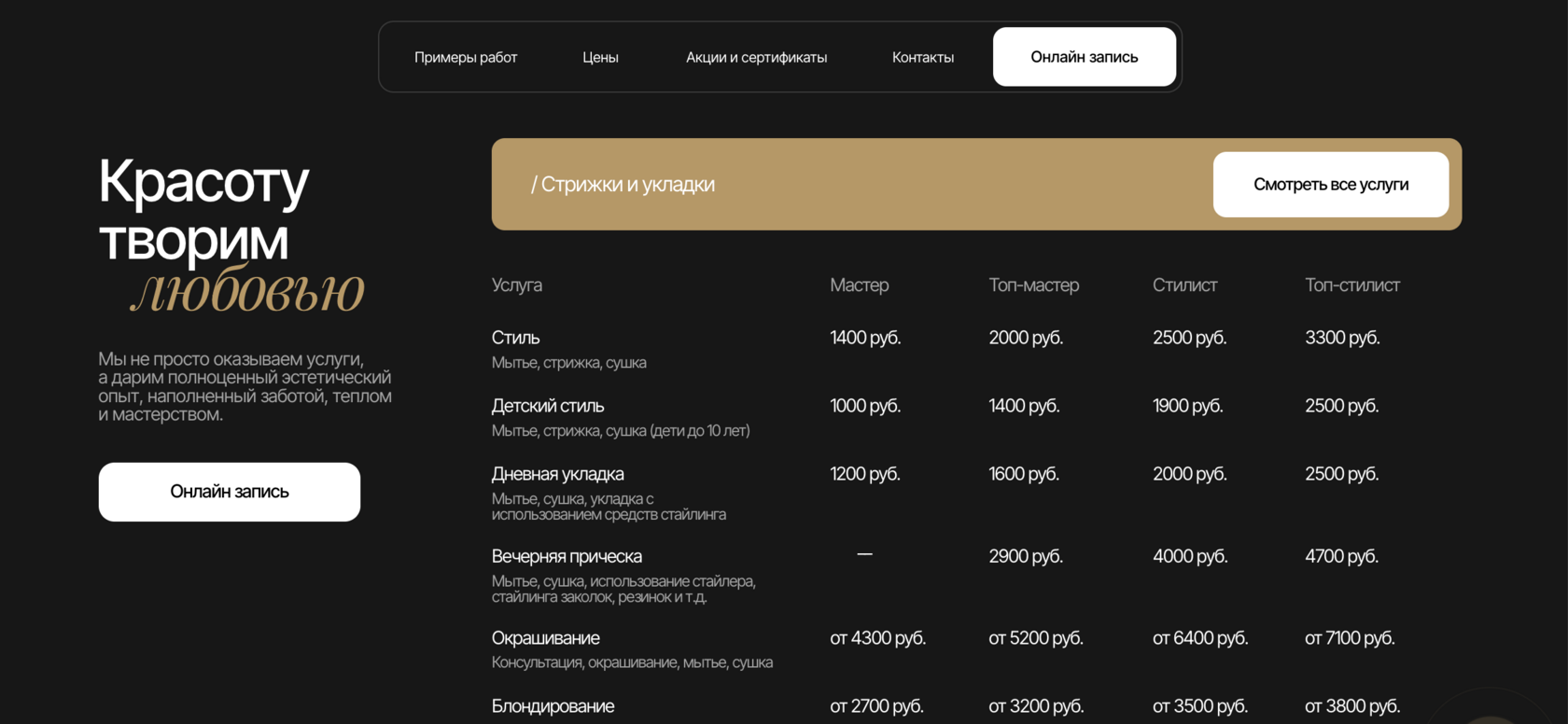 В том числе, и в юзабилити сайта. Красота без удобства – это просто картинка. Мы продумали интуитивную структуру, где легко найти нужную информацию. Прайс на видном месте, много живого контента, онлайн-запись в салон – всё это делает сайт не только красивым, но и максимально функциональным.